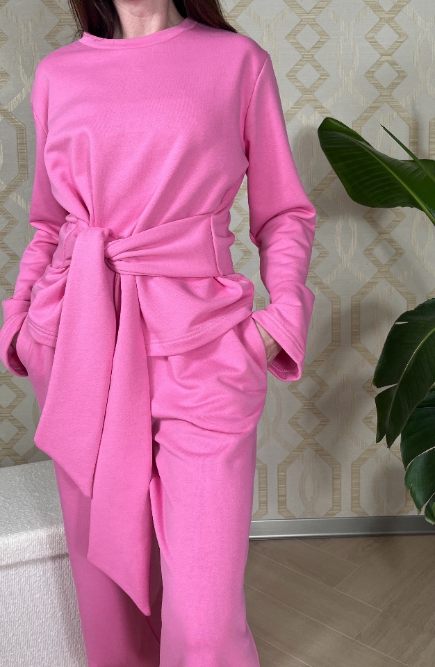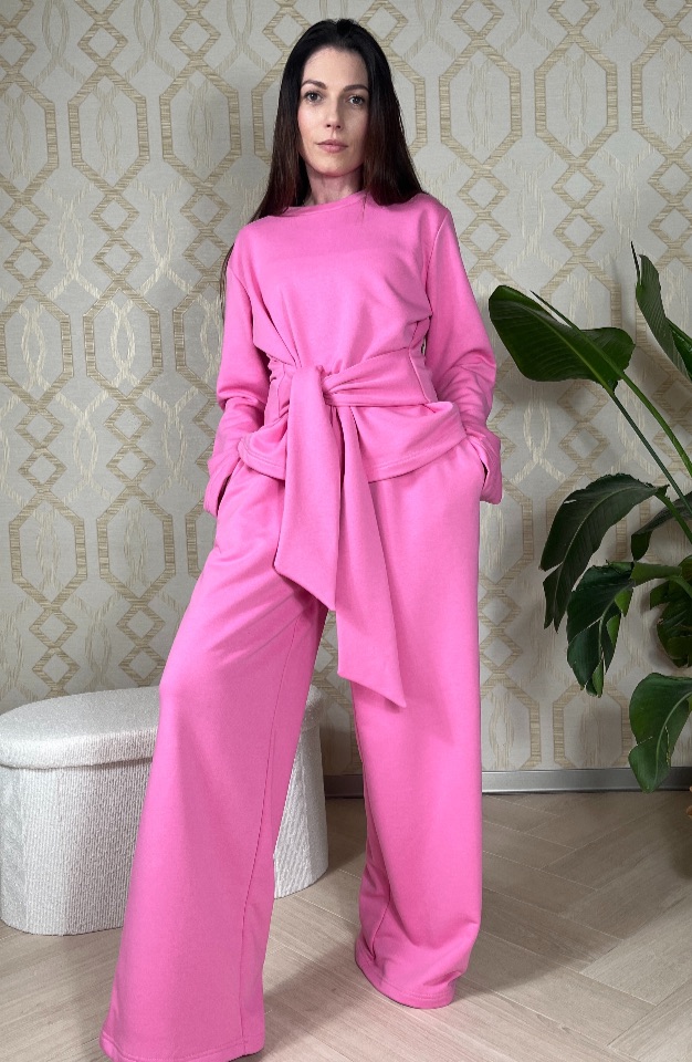 Set pozostáva z voľnej mikiny s originálnym viazaním na bokoch, ktoré si vieš ľubovoľne uviazať