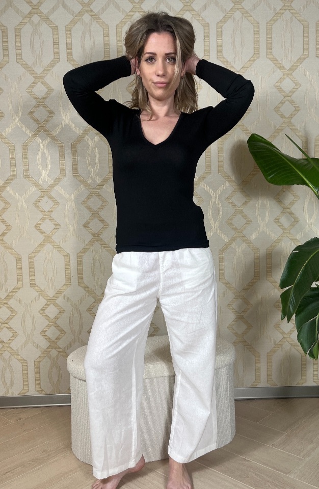 Výstrih do V opticky předlžuje krk, vypchávky krásne formuju ramená a dodávajú outfitu ženskosť.